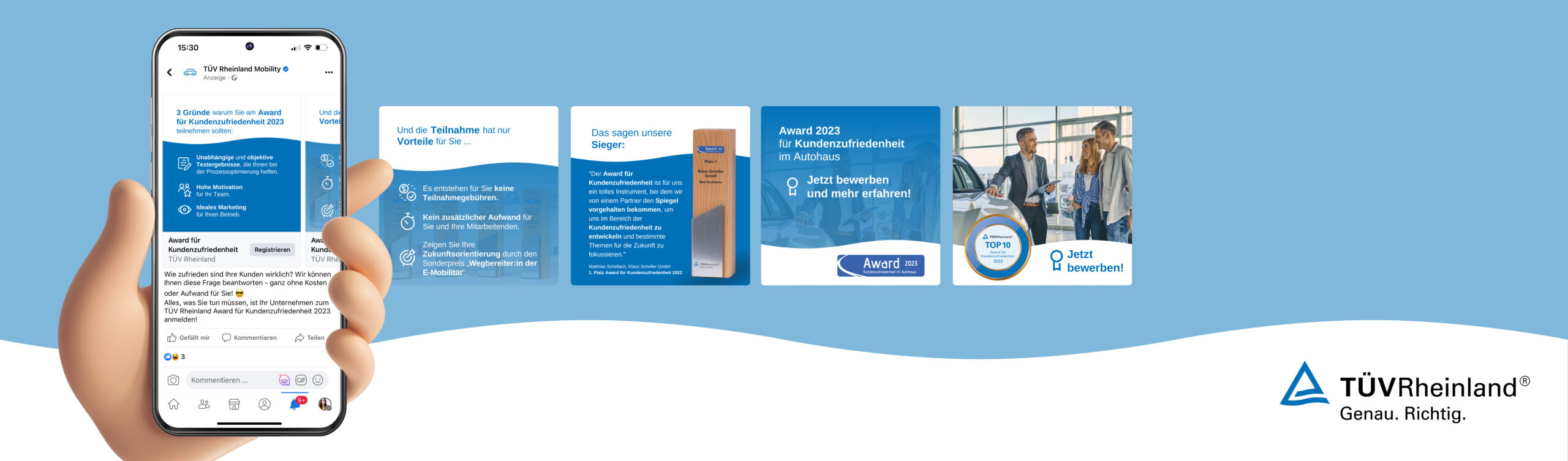 Um die Unternehmer*innen auf diesen Preis aufmerksam zu machen, setzen wir auf einen 3-stufigen Funnel. Im ersten Schritt wird mit kurzen Videosequenzen die Relevanz und Bedeutung des TÜV Awards für Kundenzufriedenheit hervorgehoben. Dazu haben wir bestehendes Videomaterial in kurze Videosequenzen geschnitten und mit einem aufmerksamkeitsstarken Intro und Outro ergänzt. Im zweiten Schritt werden die User mit einer informativen Carousel-Ad über die Vorteile des Awards kontaktiert, um dann im letzten Schritt mit einem klaren Call-to-Action zur Bewerbung animiert werden.